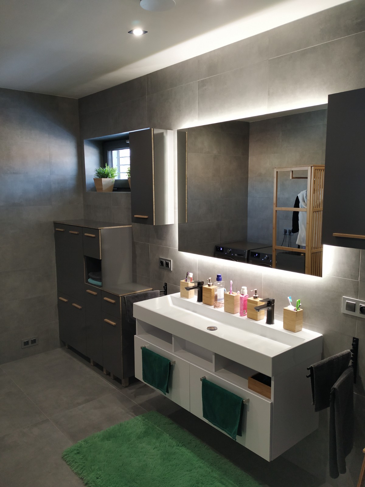 prostornou koupelnu opticky jeste nasobi zrcadlova stena na ostatnich stenach i na podlaze je velkoformatova dlazba rex imitujici design architecture bathroom