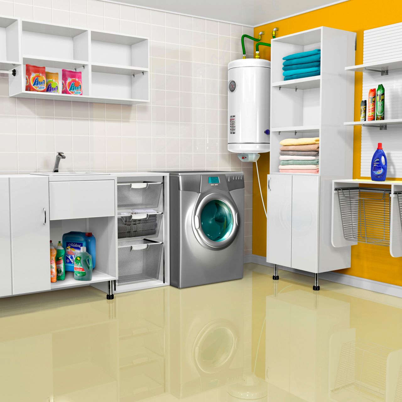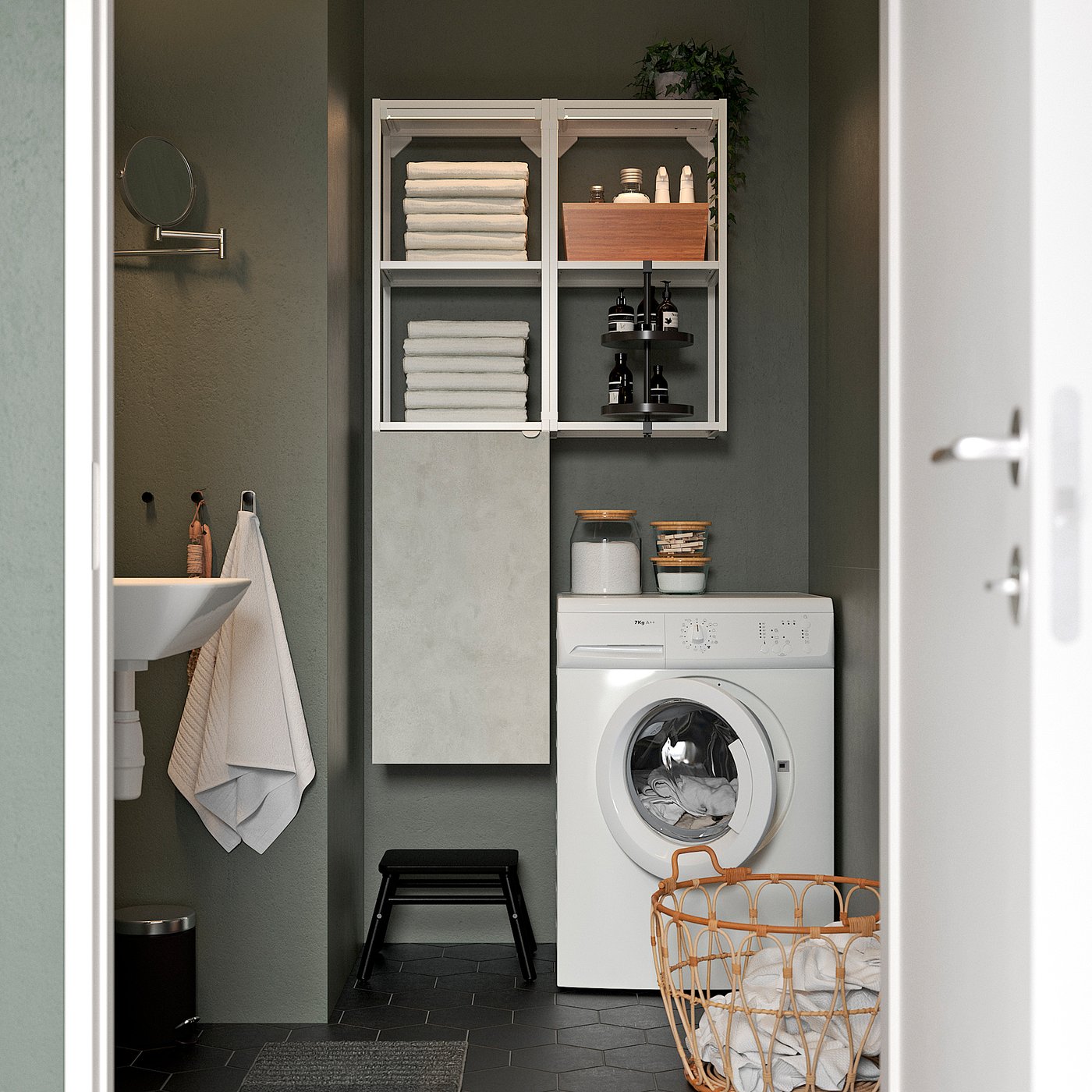 bily ulozny system s policemi a dvirky v dekoru betonu nad pracku temahome wave inhaus cz